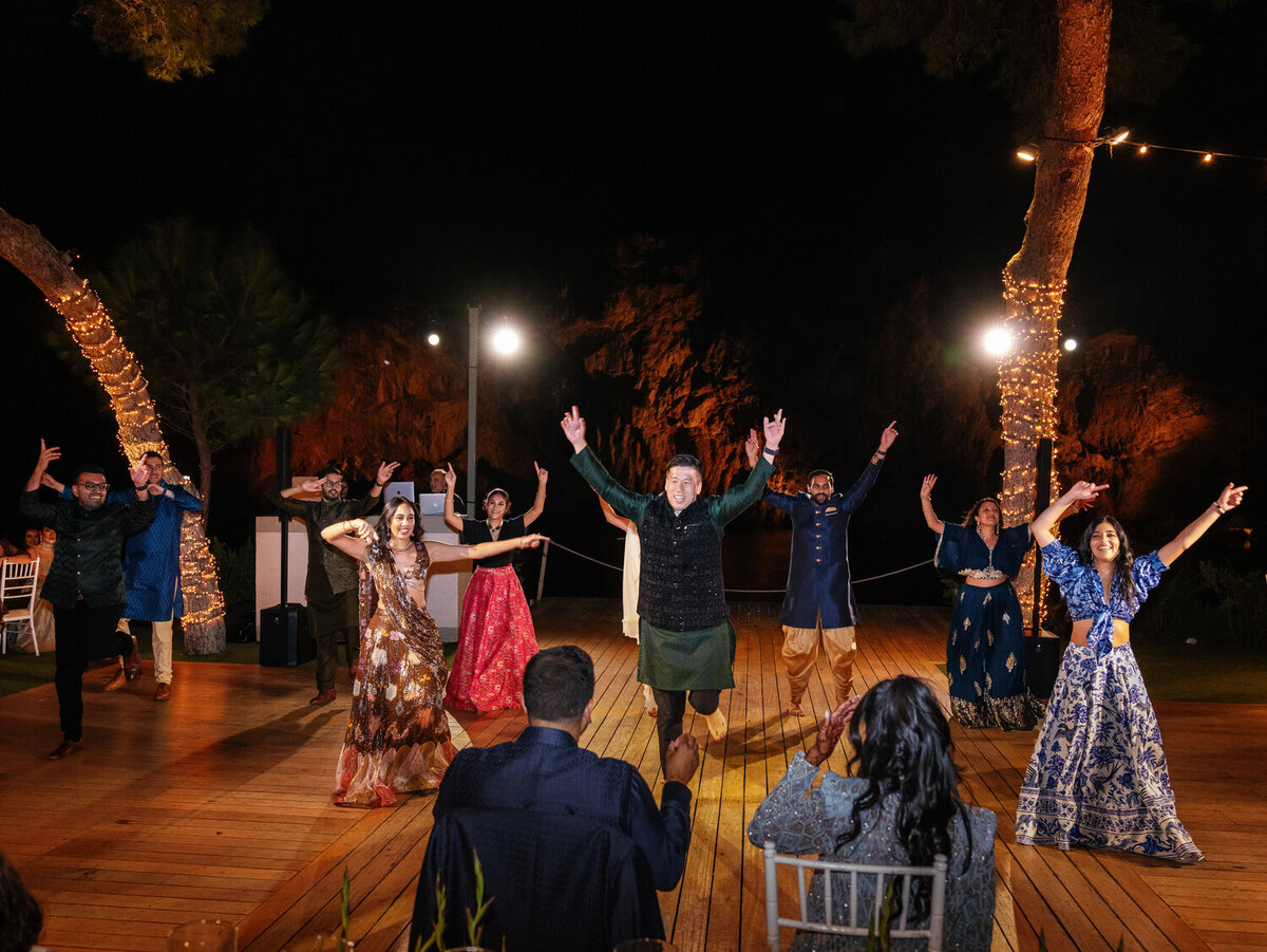 If you thought the Haldi was a blast, just wait until you hear about Pooja and Ravi’s Sangeet night! Day 2 was pure magic at the breathtaking Vouliagmeni Lake on the Athenian Riviera, and the energy was absolutely off the charts. The venue, surrounded by natural beauty, was transformed into a Bollywood-worthy party scene with vibrant fuchsia and blue decor that added a pop of color to the serene lakeside setting. The music was pumping, the lights were glowing, and the dance floor was on fire—literally no one could resist joining in!