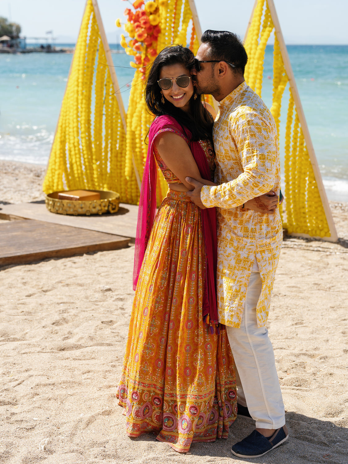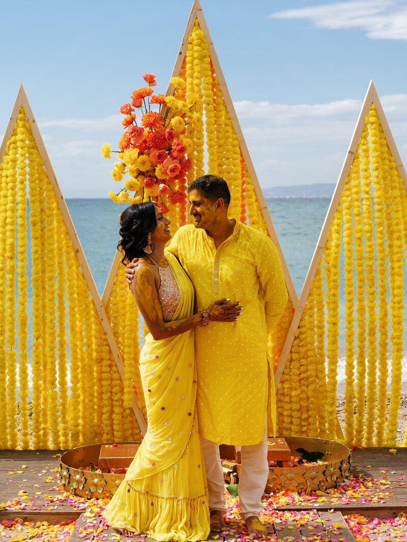Pooja and Ravi’s Haldi ceremony took place at a super fun beach bar on the stunning Athenian Riviera, and it was everything you could dream of for a colorful celebration! With the sound of waves in the background and sand beneath their feet, this was not just any pre-wedding ritual—it was a splashy, sun-kissed party full of laughter, color, and pure joy. Their wedding planner went all out with the decor, creating an amazing backdrop of three vibrant yellow pyramids that perfectly complemented the golden turmeric tradition. It was the perfect pop of color against the beachy vibes!