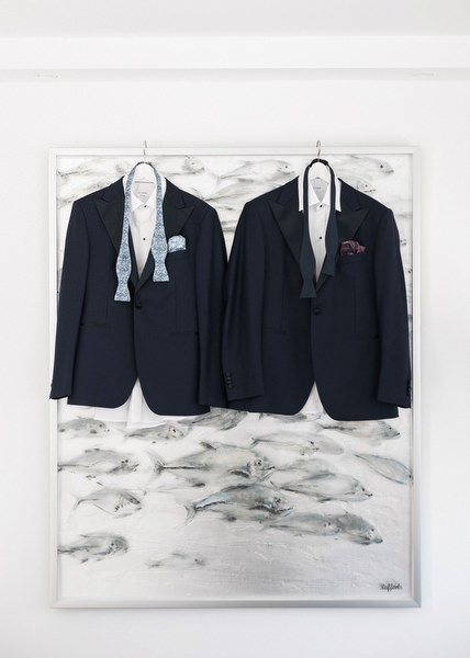 The wedding day began at their private cabana, where preparations unfolded like a scene from a movie. Lars and Matthias’ impeccable sense of style shone brightly: tailored black tuxedos, matching Thame Jimmy Choos, and bold Cartier jewelry made their looks unforgettable. These sartorial details were not only Instagram-worthy but also perfectly aligned with the grandeur of a wedding in Nammos Mykonos.