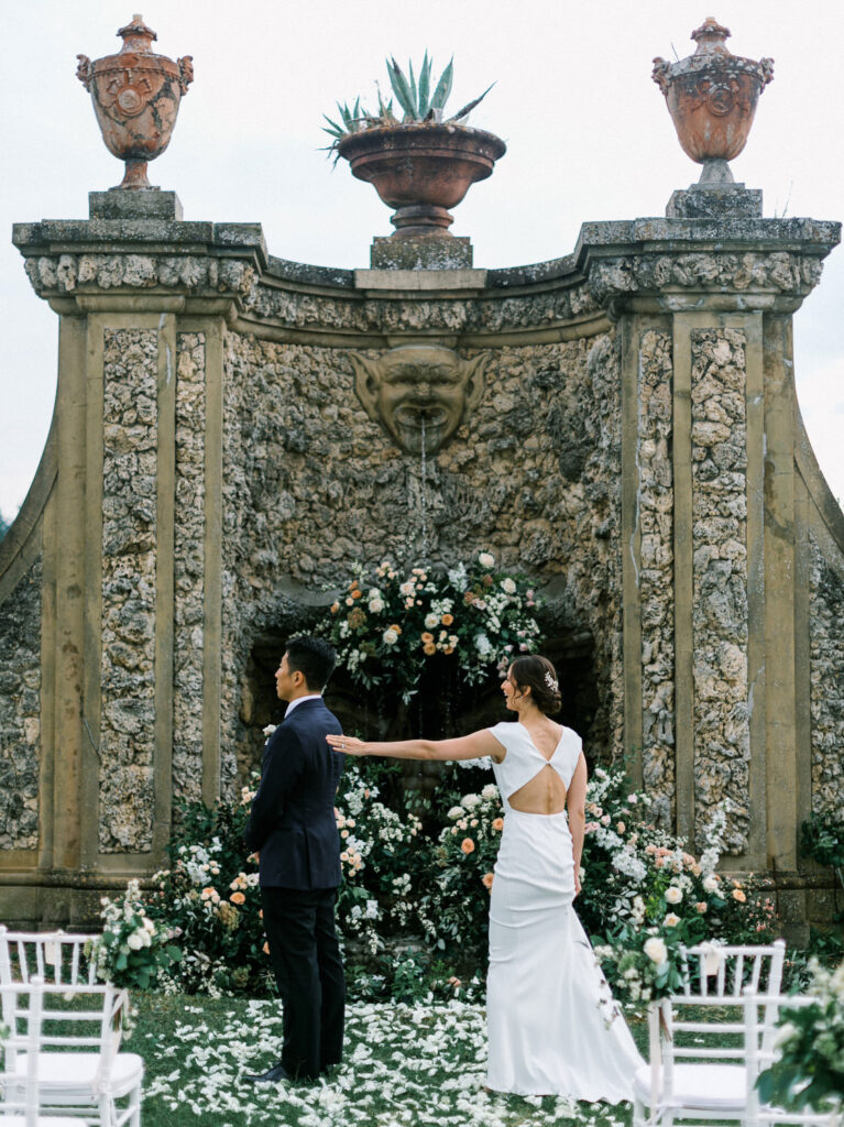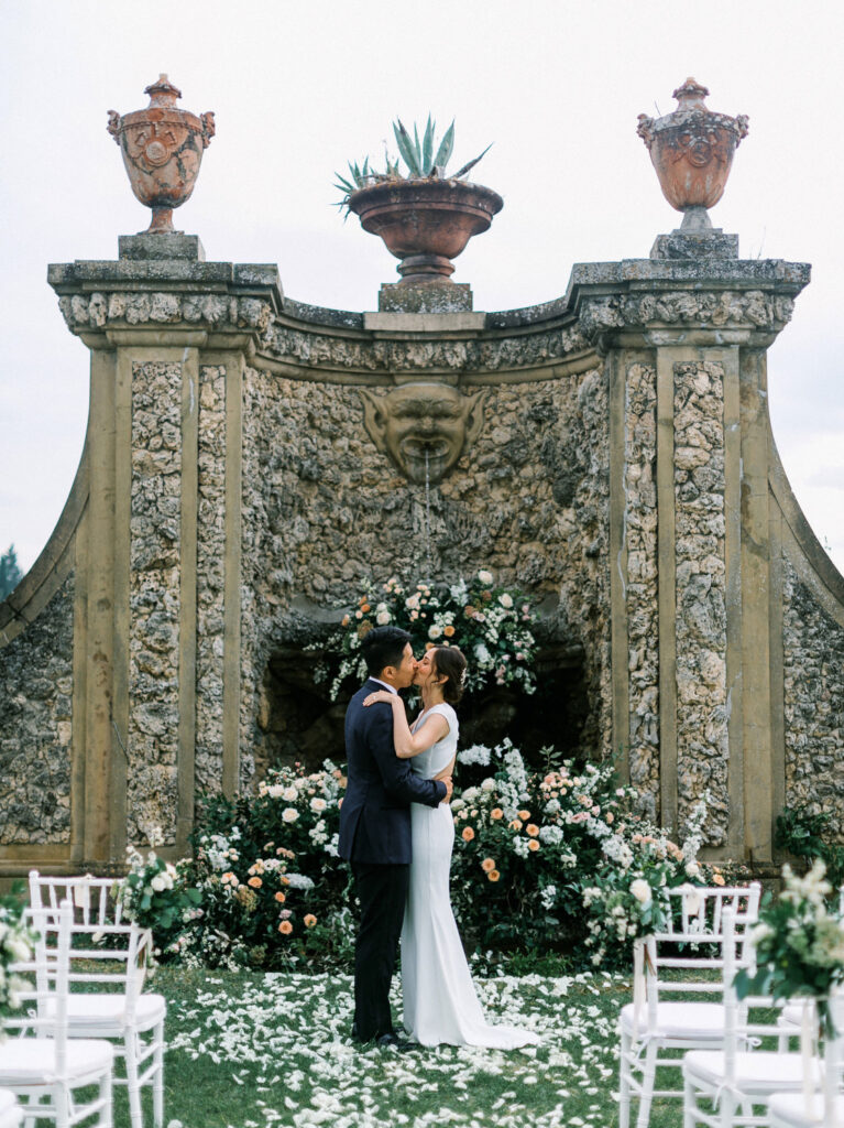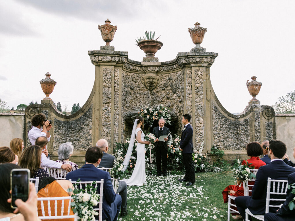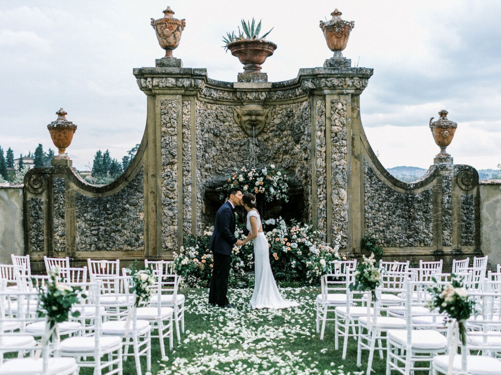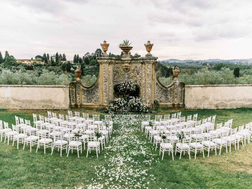 Set in the Medici villa gardens, the ceremony unfolded in a romantic semi-circle of white Chiavari chairs, lush floral arches framing the ornate fountain, and a petal-strewn aisle that left no dry eye behind.