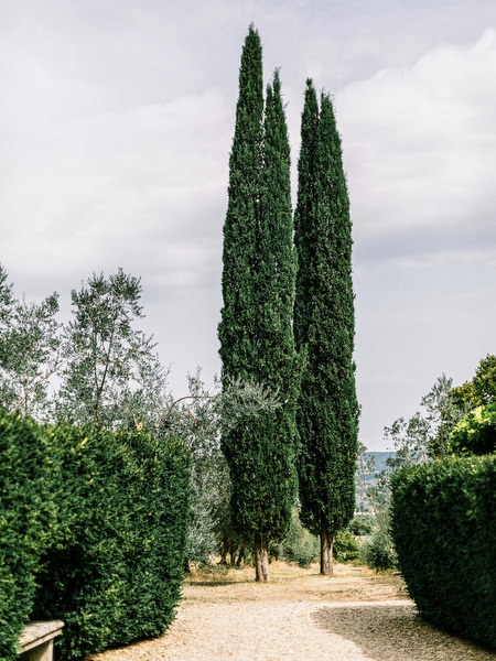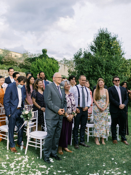 As the rain fell during preparations, the skies cleared just moments before the ceremony began. Bathing the gardens in golden Tuscan light. “It’s good luck if it rains on your wedding day,” the bride said — and Tuscany delivered its magic.